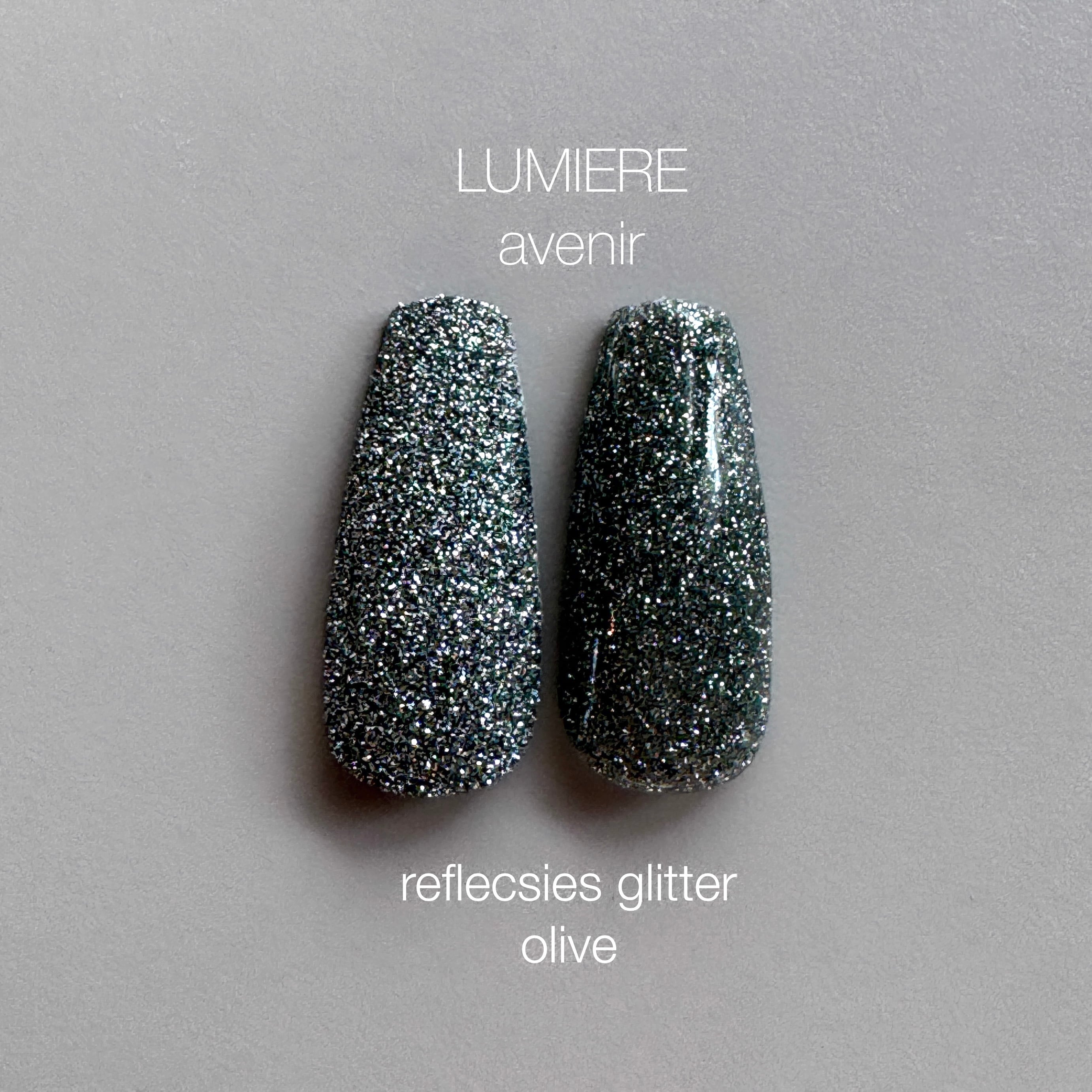 大人くすみカラーのフラッシュグリッター、リフレクシーズグリッター オリーブは、きらきらと輝く新感覚のアイテムです。フラッシュなしでもその魅力がしっかりと伝わり、どんなデザインにも洗練された印象を与えます。